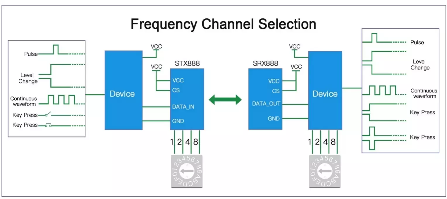 Модуль может передавать любую цифровую форму волны (например, импульс или серийная форма волны…) с частотой ниже 9,6 кГц. Группа модулей состоит из модуля передачи (STX888) и приемного модуля (SRX888). Входной сигнал сигнала в контакт данных передаваемого модуля будет выводиться на контакте данных приемного модуля.