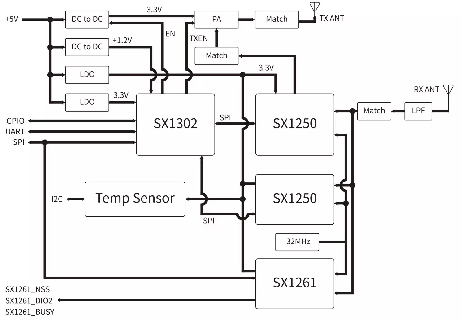 LoRaWan1302 — трансивер с двумя антеннами, отделяющими передающую антенну от приемной.