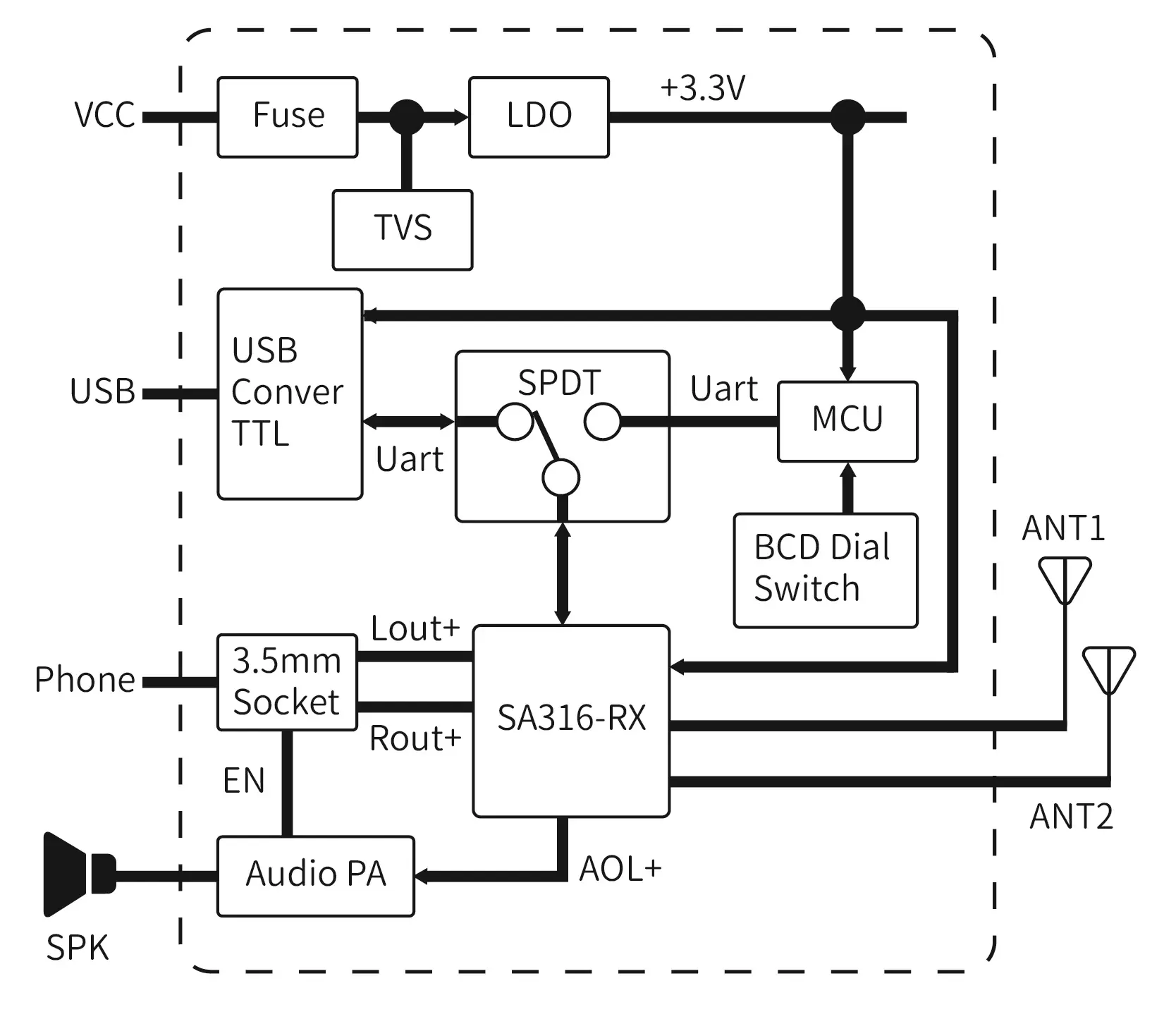 Беспроводной аудиомодуль SA326 включает в себя два основных компонента: модуль передатчика SA326-TX и модуль приемника SA326-RX. Эти модули разработаны для работы в паре, обеспечивая стабильную и качественную передачу аудиосигнала. Благодаря использованию передовых технологий, SA326 гарантирует минимальную задержку, что особенно важно для приложений, требующих синхронного воспроизведения звука.