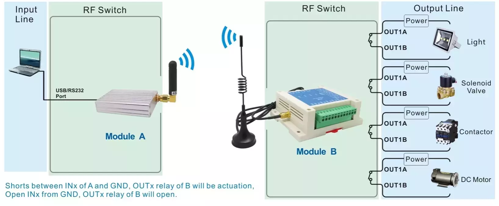 SK108U включает SK108U-TX и SK108U-RX. SK108U-TX — это промышленный передатчик последовательного управления, он работает с SK108U-RX для создания системы управления беспроводным переключателем. SK108U-TX — это последовательный интерфейс, который можно подключать к ПК и другим последовательным устройствам. Один SK108U-RX имеет 4-канальный релейный выход. Один SK108U-TX может управлять несколькими SK108U-RX. Частоту SK108U-TX и SK108U-Rx можно настроить, чтобы избежать частотных помех.